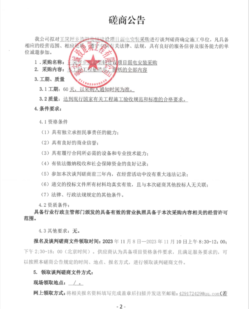 王崗坪鄉(xiāng)旅游集鎮(zhèn)建設(shè)項(xiàng)目弱電安裝采購(gòu)談判磋商公告