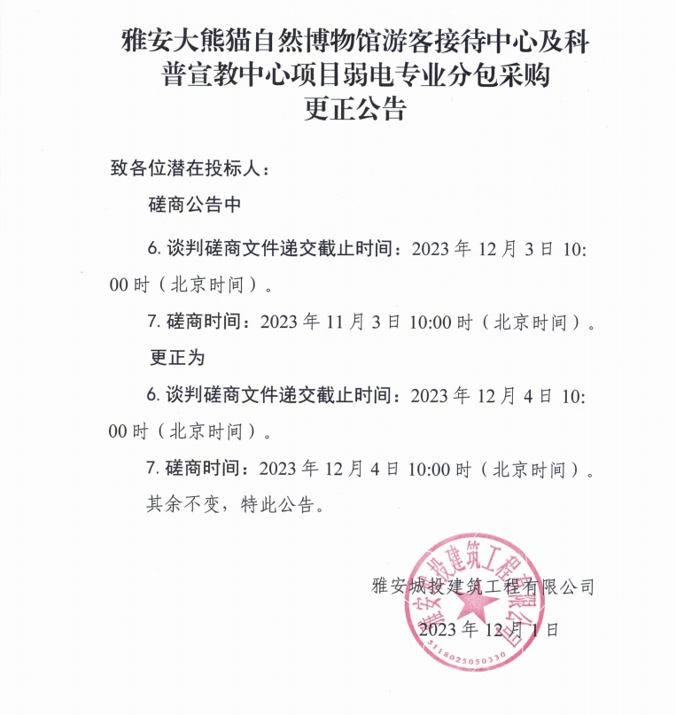 雅安大熊貓自然博物館接待中心及科普宣教中心項目弱電專業(yè)分包采購更正公告