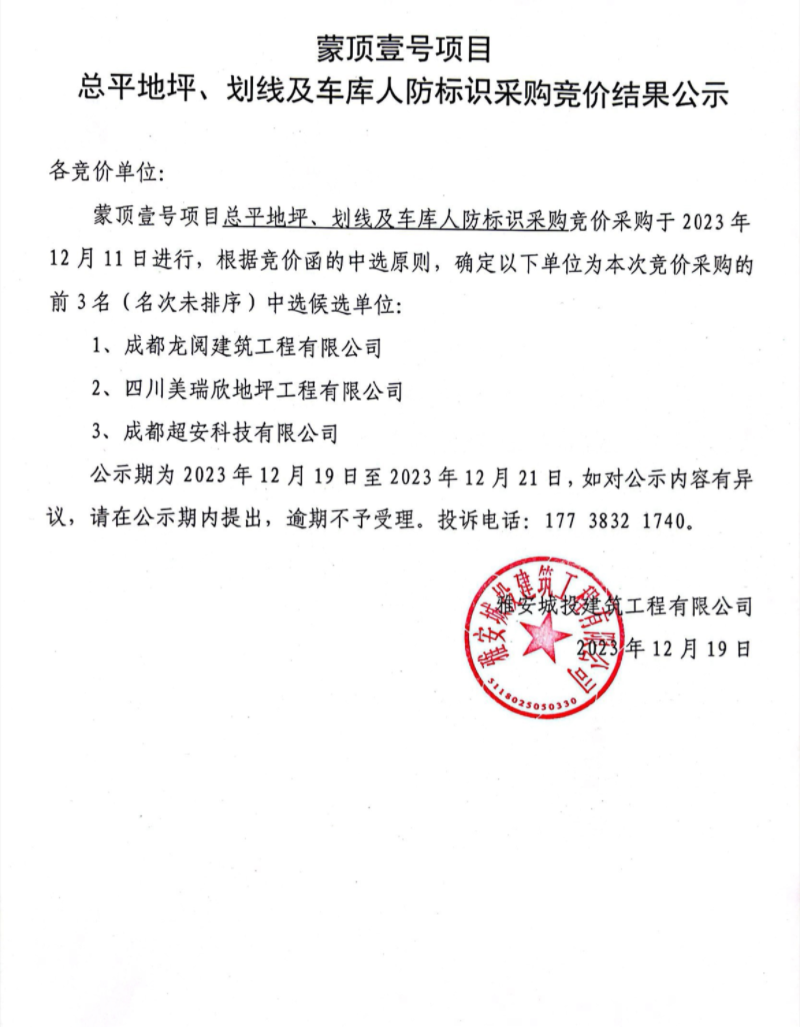 蒙頂壹號項目總平地坪、劃線及車庫人防標識采購競價結(jié)果公示