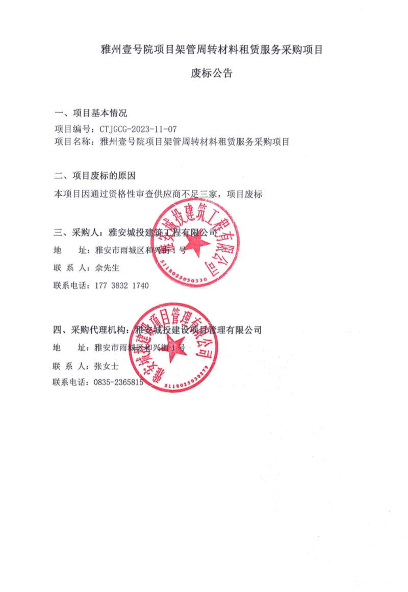 雅州壹號(hào)項(xiàng)目架管周轉(zhuǎn)材料租賃服務(wù)采購項(xiàng)目廢標(biāo)公告