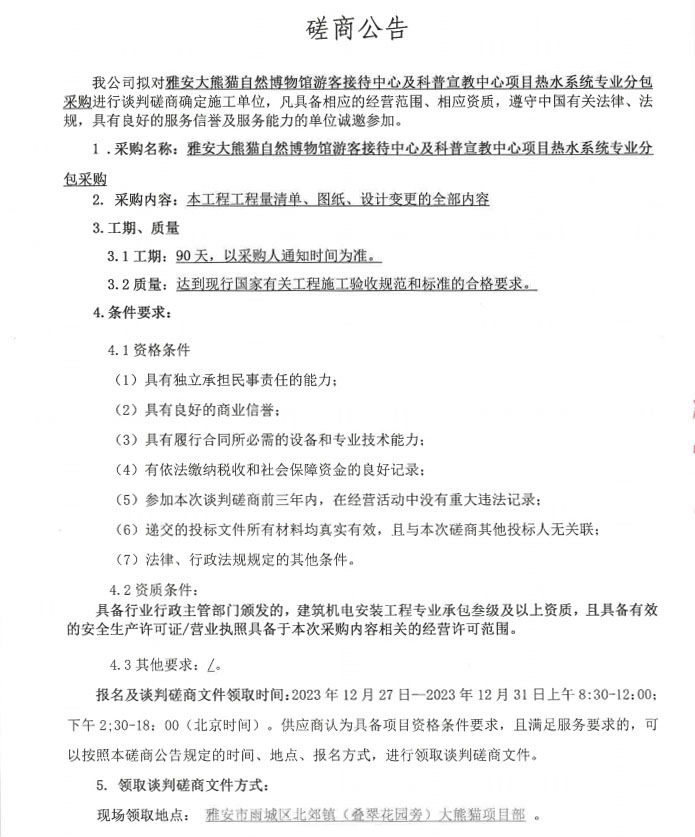 雅安大熊貓自然博物館游客接待中心及科普宣教中心項目熱水系統(tǒng)專業(yè)分包采購談判磋商公告