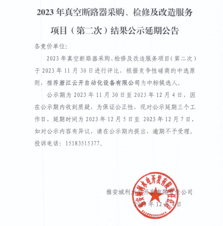 2023年真空斷路器采購、檢修及改造服務項目(第二次)結果公示延期公告