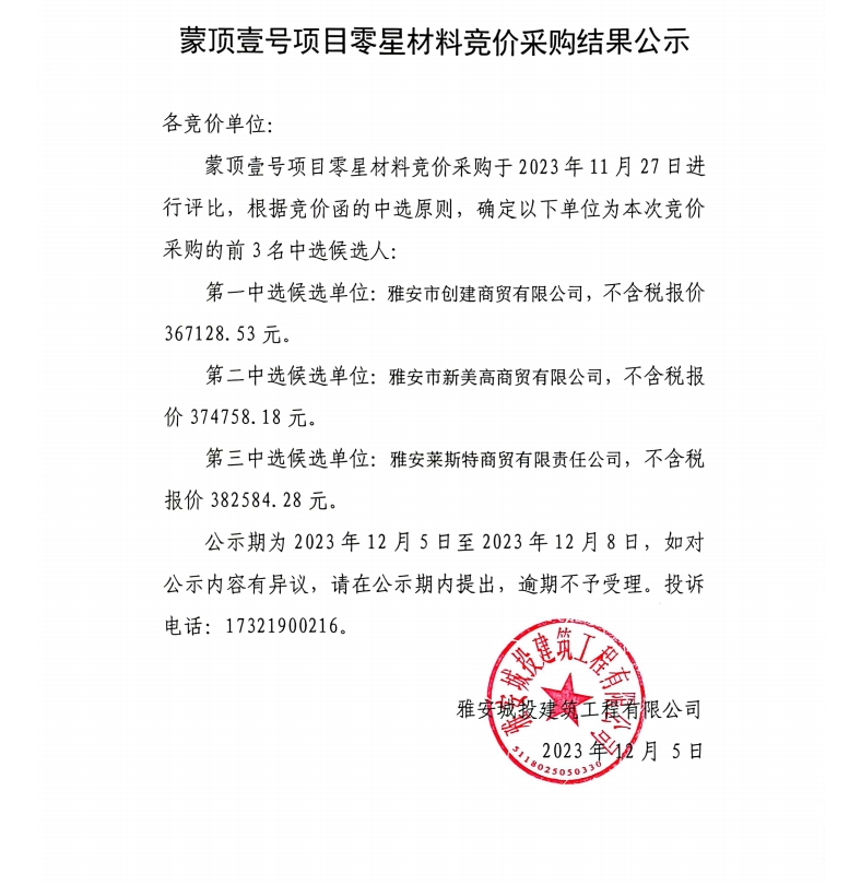 蒙頂壹號(hào)項(xiàng)目零星材料競(jìng)價(jià)采購(gòu)結(jié)果公示