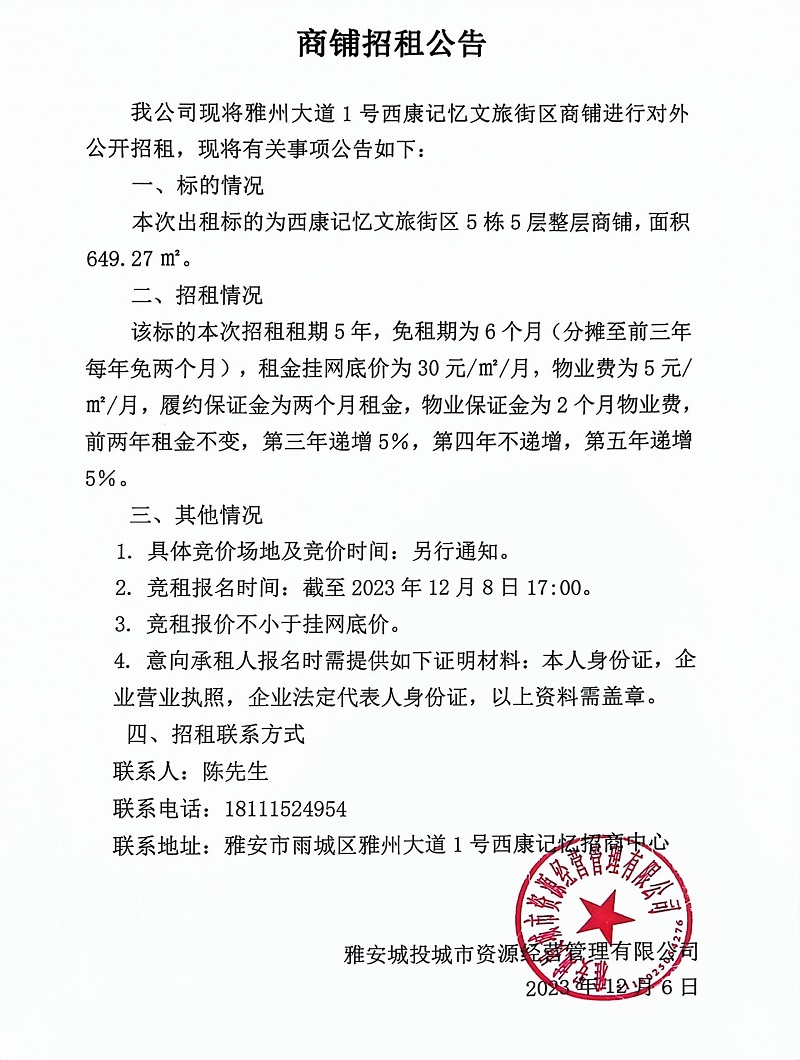 雅州大道1號(hào)西康記憶文旅街區(qū)商鋪招租公告