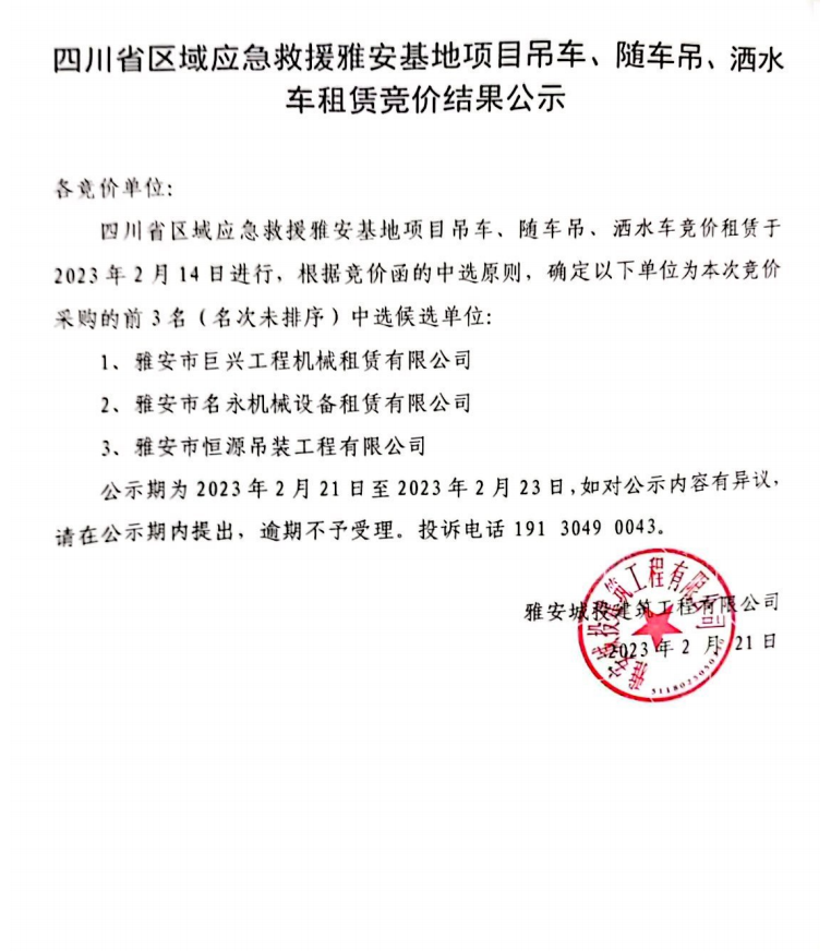 四川省區(qū)域應急救援雅安基地項目吊車、隨車吊、灑水車租賃競價結果公示