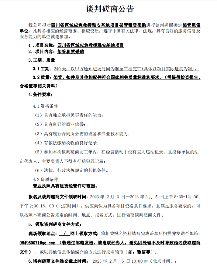 四川省區(qū)域應急救援雅安基地項目架管租賃采購談判磋商公告