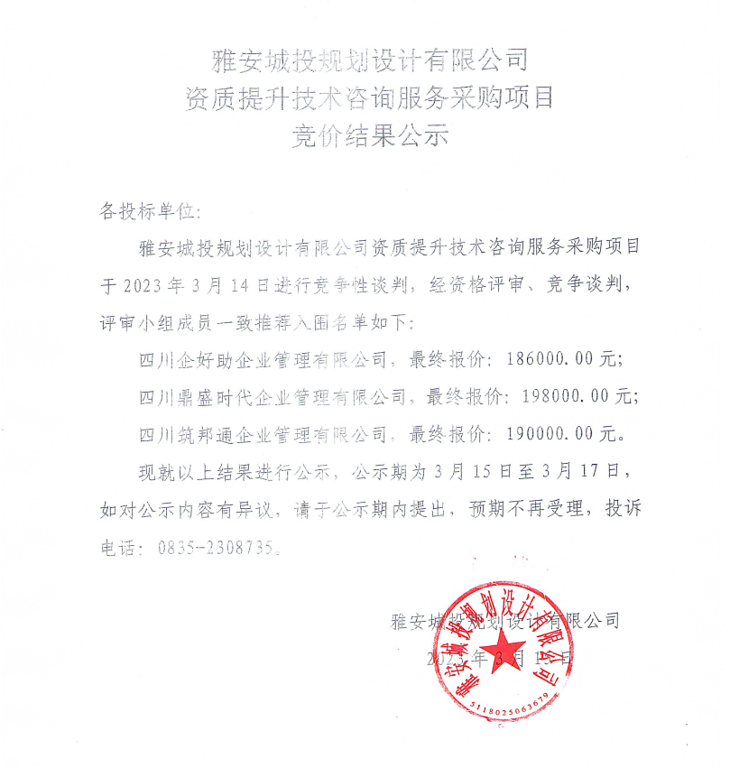 雅安城投規(guī)劃設計有限公司資質(zhì)提升技術咨詢服務采購項目競價結(jié)果公示