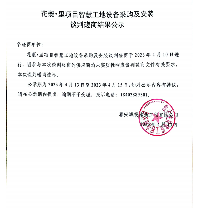 花襄·里項目智慧工地設采購備及安裝談判磋商結果公示
