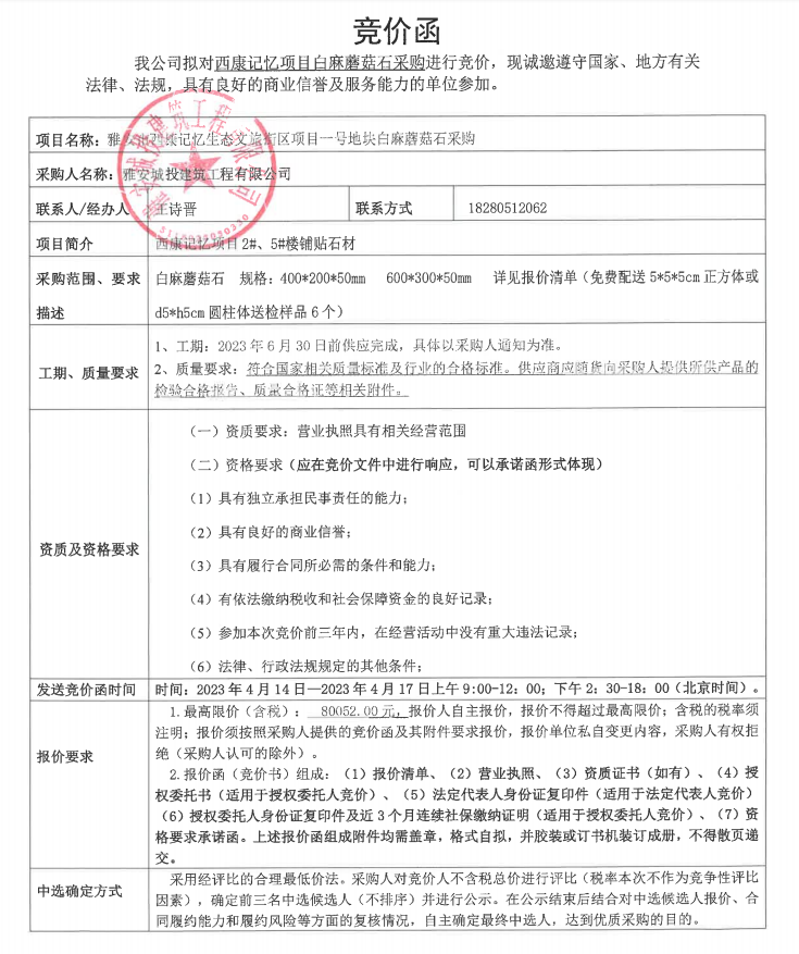 雅安市西康記憶生態(tài)文旅街區(qū)項目一號地塊白麻蘑菇石競價采購公告