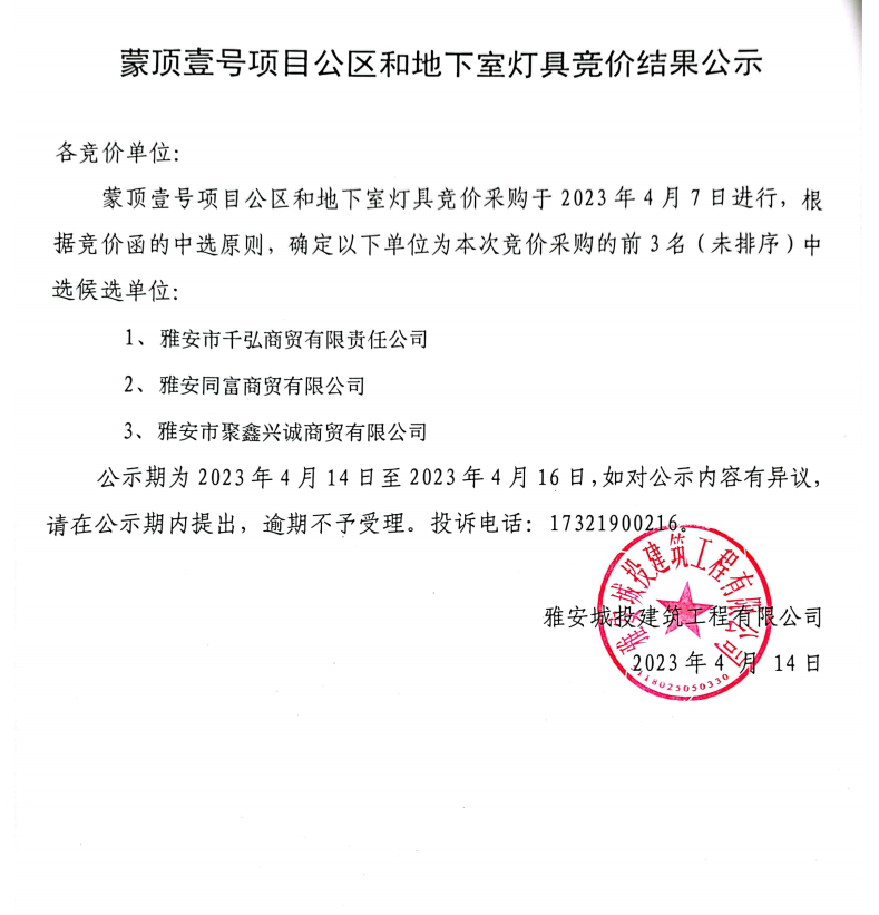 蒙頂壹號項(xiàng)目公區(qū)和地下室燈具競價(jià)結(jié)果公示