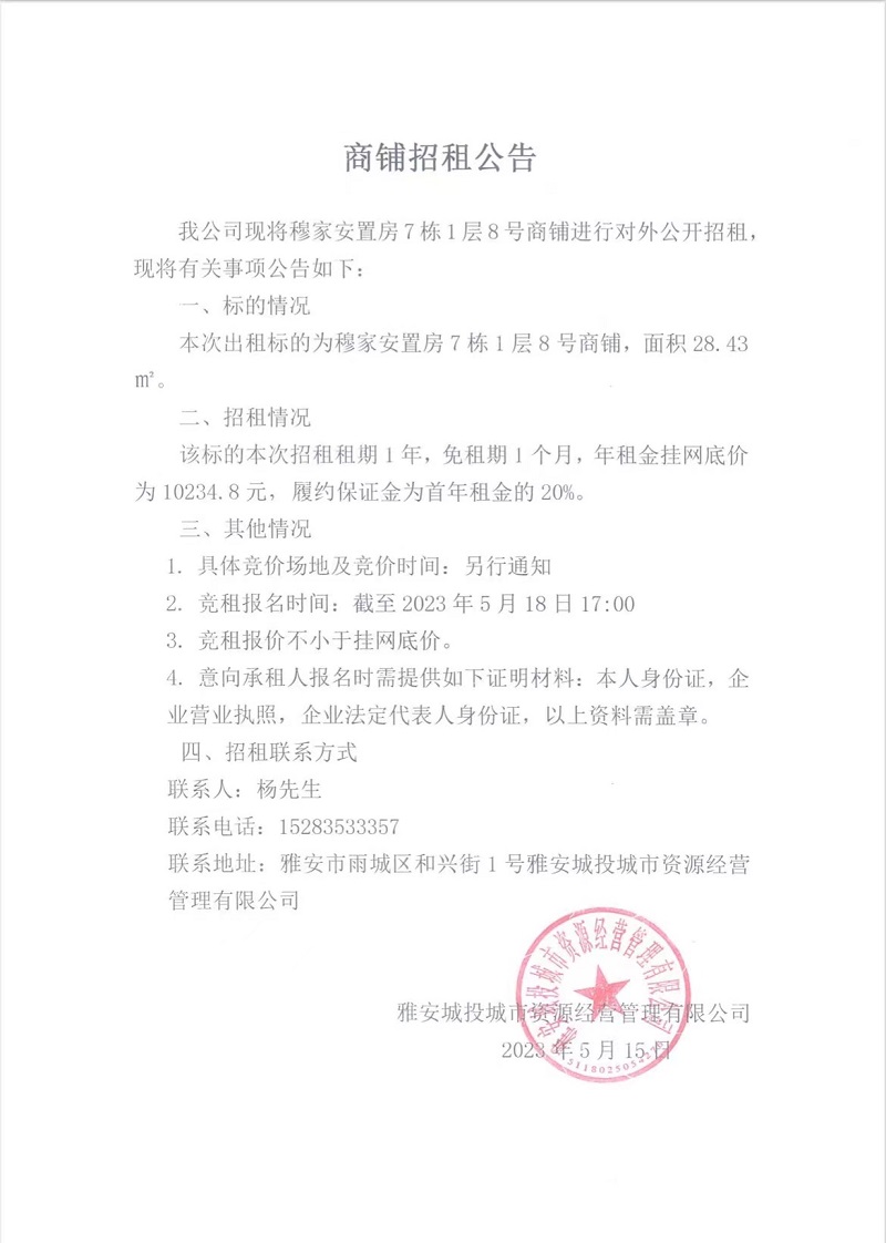 穆家安置房7棟1層8號商鋪招租公告