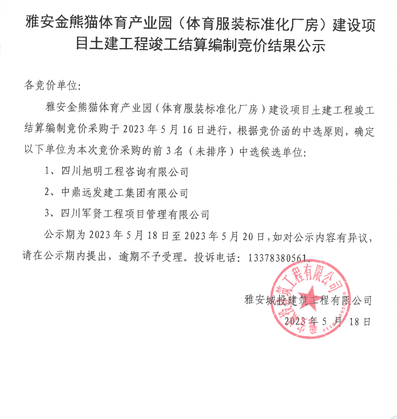 雅安金熊貓?bào)w育產(chǎn)業(yè)園(體育服裝標(biāo)準(zhǔn)化廠房)建設(shè)項(xiàng)目土建工程竣工結(jié)算編制競價(jià)結(jié)果公示