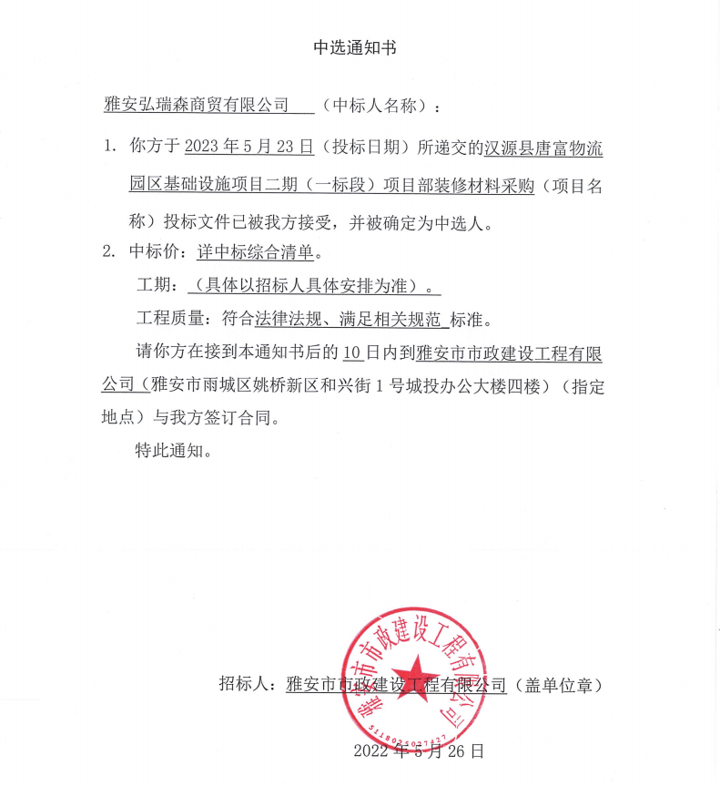 漢源縣唐富物流園區(qū)基礎(chǔ)設(shè)施項(xiàng)目二期(一標(biāo)段)項(xiàng)目部裝修材料采購中選通知書