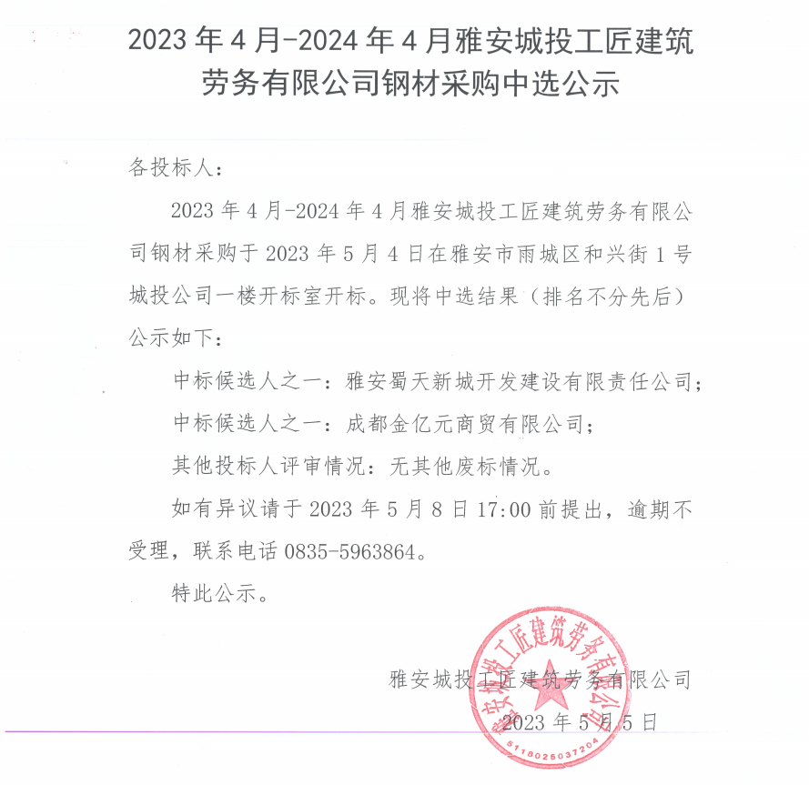 2023年4月-2024年4月雅安城投工匠建筑勞務(wù)有限公司鋼材采購中選公示