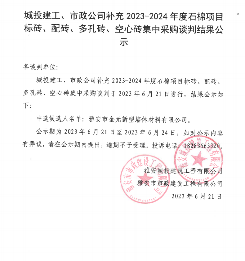 城投建工、市政公司補充2023-2024年度石棉項目標(biāo)磚、配磚、多孔磚、空心磚集中采購談判結(jié)果公示