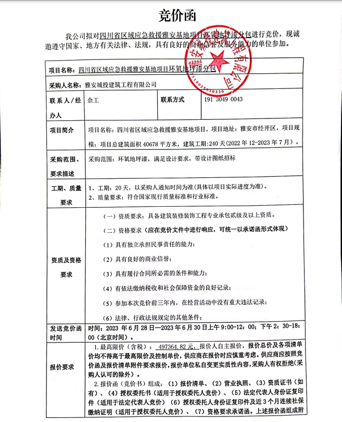 四川省區(qū)域應(yīng)急救援雅安基地項(xiàng)目環(huán)氧地坪漆分包競(jìng)價(jià)公告