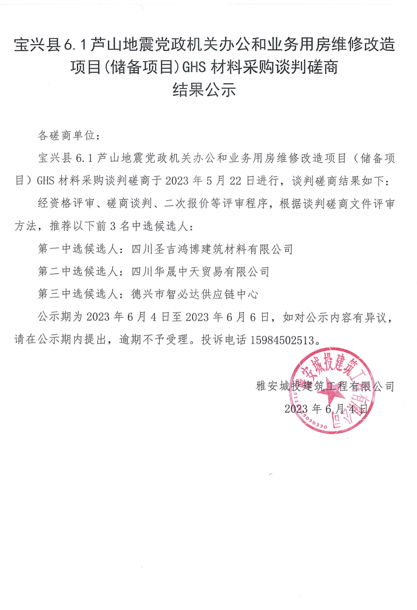 寶興縣6.1蘆山地震黨政機(jī)關(guān)辦公和業(yè)務(wù)用房維修改造項(xiàng)目(儲備項(xiàng)目)GHS材料采購談判磋商結(jié)果公示