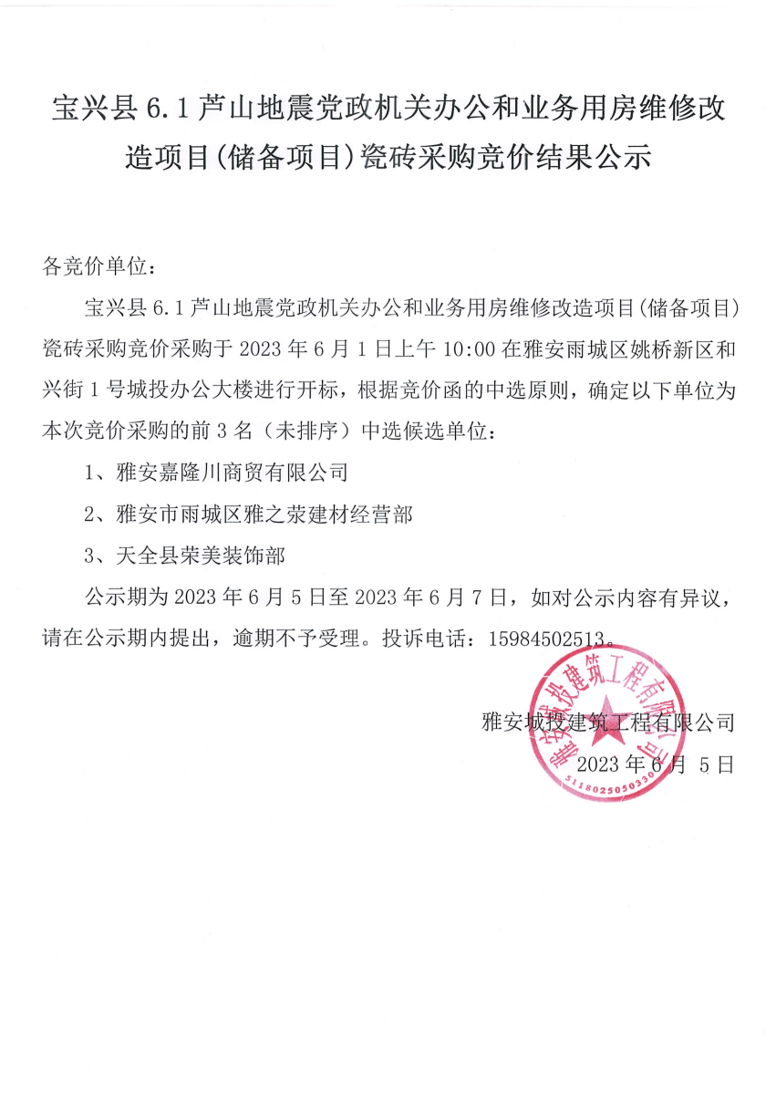 寶興縣6.1蘆山地震黨政機(jī)關(guān)辦公和業(yè)務(wù)用房維修改造項(xiàng)目(儲(chǔ)備項(xiàng)目)瓷磚采購(gòu)競(jìng)價(jià)結(jié)果公示