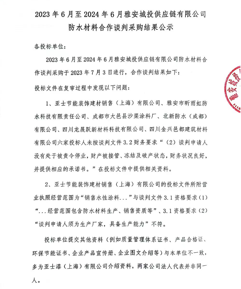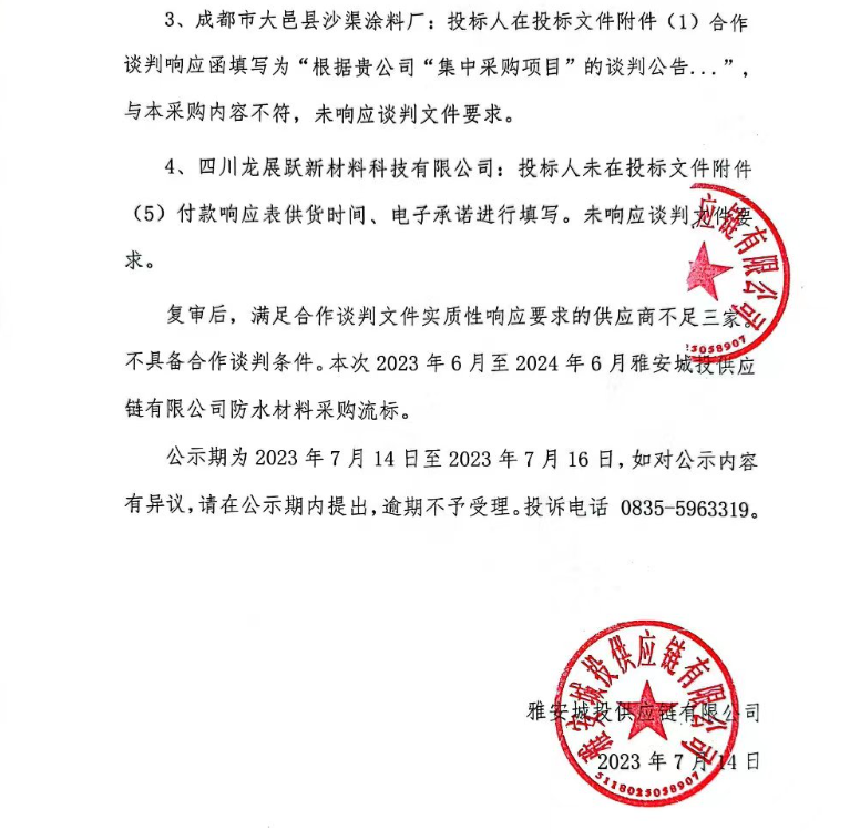 2023年6月至2024年6月雅安城投供應(yīng)鏈有限公司防水材料合作談判采購結(jié)果公示