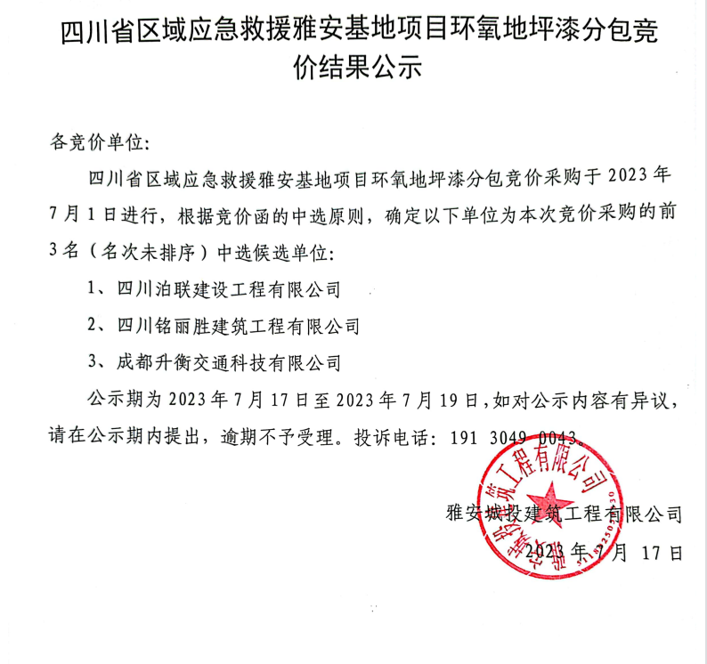四川省區(qū)域應(yīng)急救援雅安基地項(xiàng)目環(huán)氧地坪漆分包競價結(jié)果公示