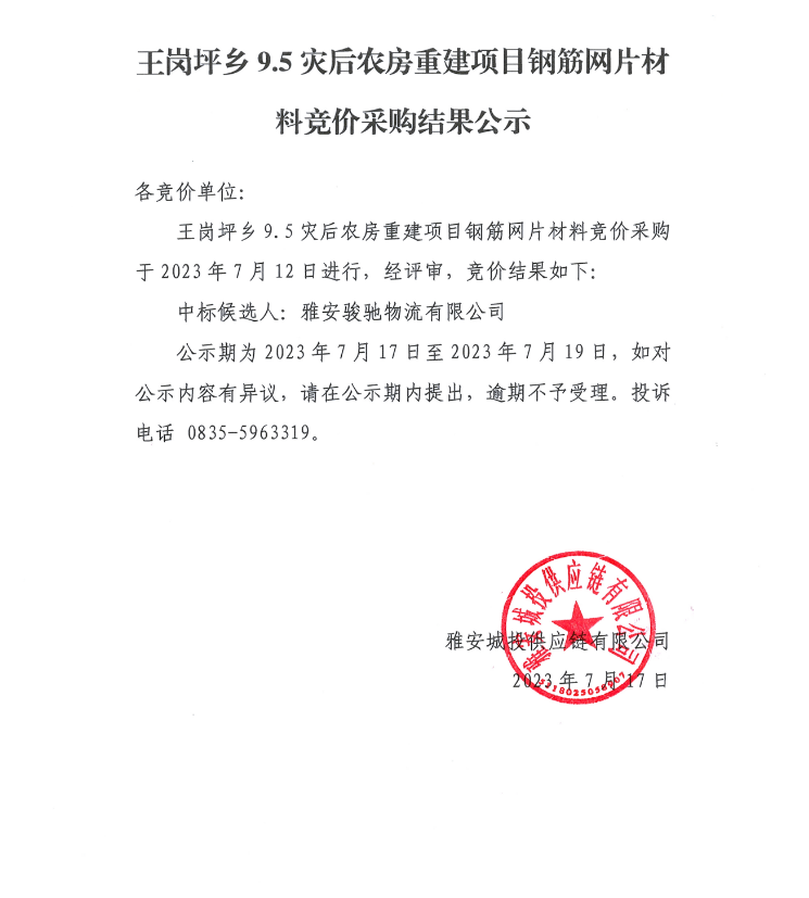 王崗坪鄉(xiāng)9.5災后農(nóng)房重建項目鋼筋網(wǎng)片材料競價采購結(jié)果公示