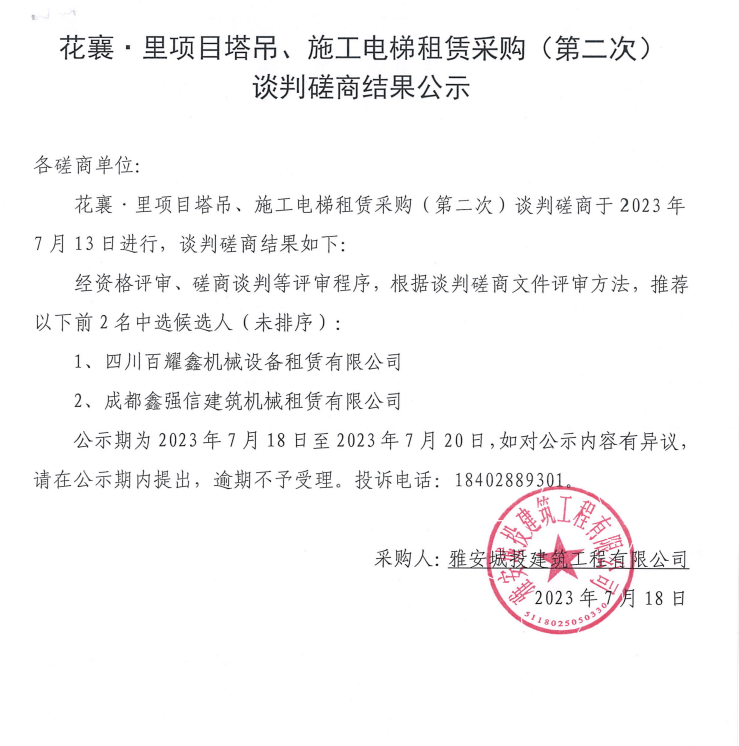 花襄·里項目塔吊、施工電梯租賃采購(第二次)談判磋商結果公示