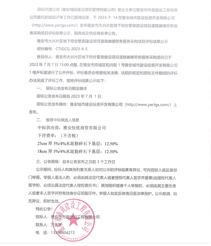 雅安市大興片區(qū)地下綜合管廊建設(shè)項(xiàng)目道路攤鋪勞務(wù)服務(wù)采購(gòu)項(xiàng)目評(píng)標(biāo)結(jié)果公示