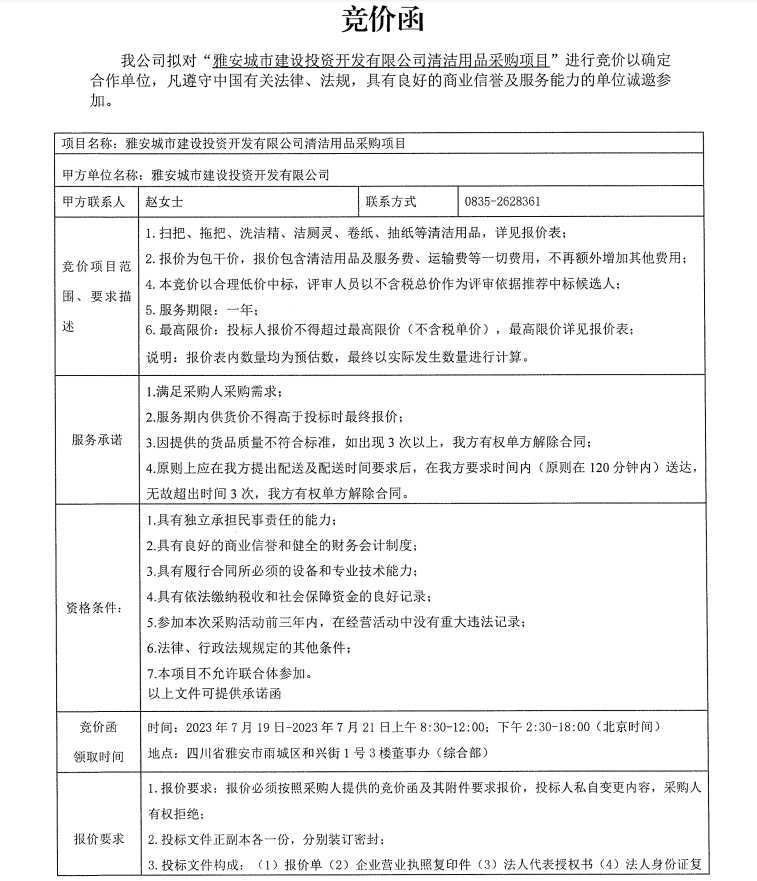 雅安城市建設投資開發(fā)有限公司清潔用品采購項目競價公告
