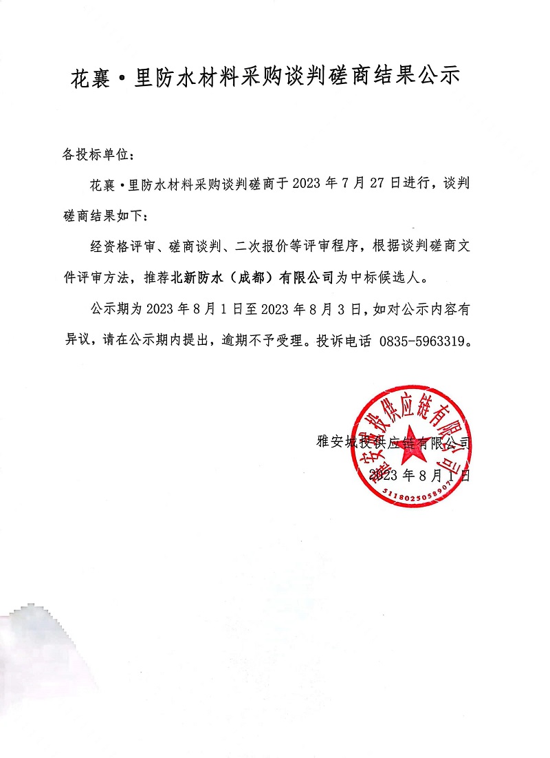 花襄·里防水材料采購(gòu)談判磋商結(jié)果公示
