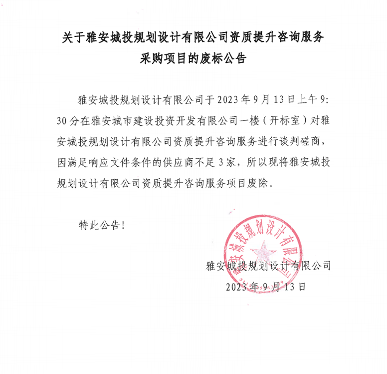 關(guān)于雅安城投規(guī)劃設(shè)計(jì)有限公司資質(zhì)提升咨詢服務(wù)采購(gòu)項(xiàng)目的廢標(biāo)公告