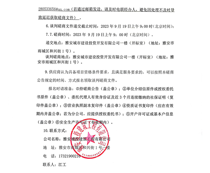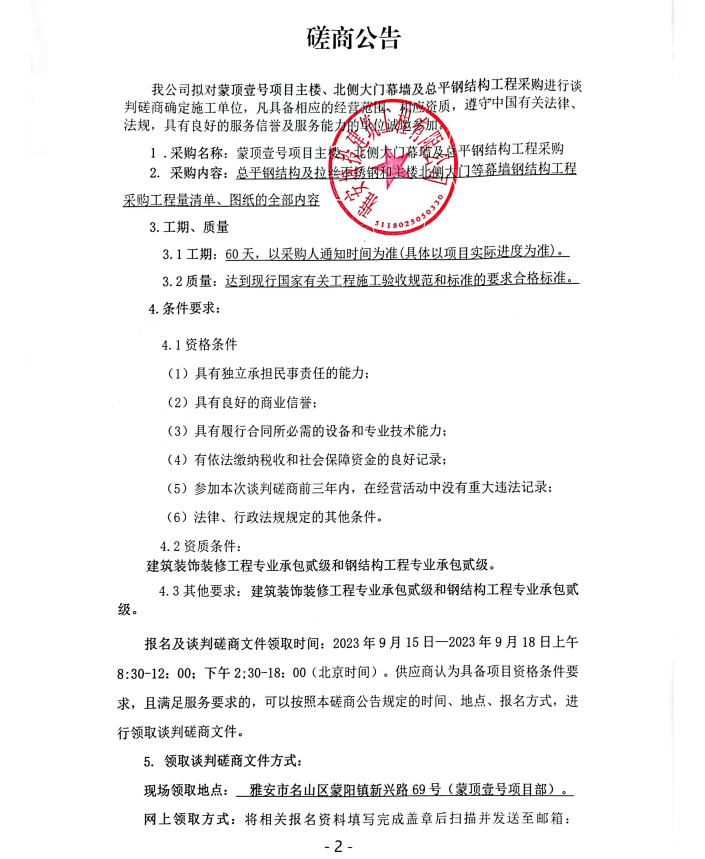 蒙頂壹號項目主樓、北側大門幕墻及總平鋼結構工程采購談判磋商公告