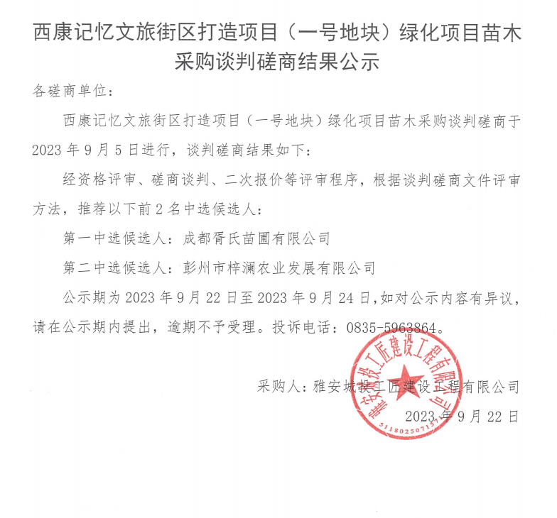 西康記憶文旅街區(qū)打造項目(一號地塊)綠化項目苗木采購談判磋商結(jié)果公示