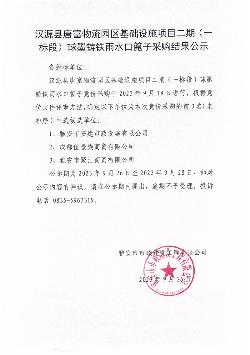 漢源縣唐富物流園區(qū)基礎(chǔ)設(shè)施項目二期(一標(biāo)段)球墨鑄鐵雨水口篦子采購結(jié)果公示