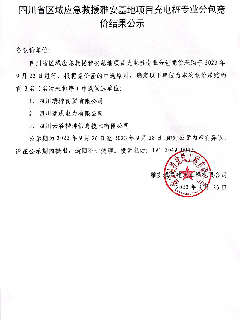 四川省區(qū)域應(yīng)急救援雅安基地項(xiàng)目充電樁專業(yè)分包競價(jià)結(jié)果公示