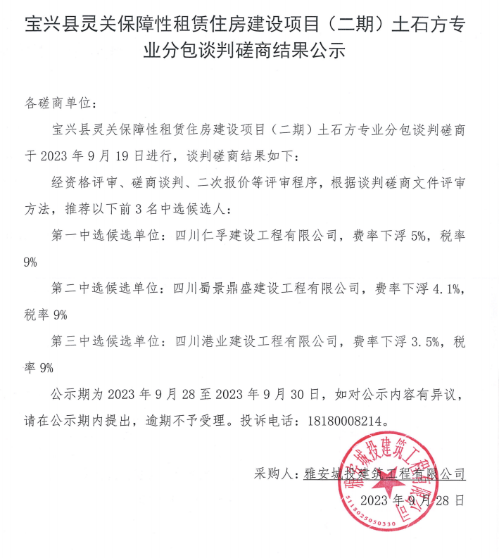 寶興縣靈關(guān)保障性租賃住房建設項目(二期)土石方專業(yè)分包談判磋商結(jié)果公示
