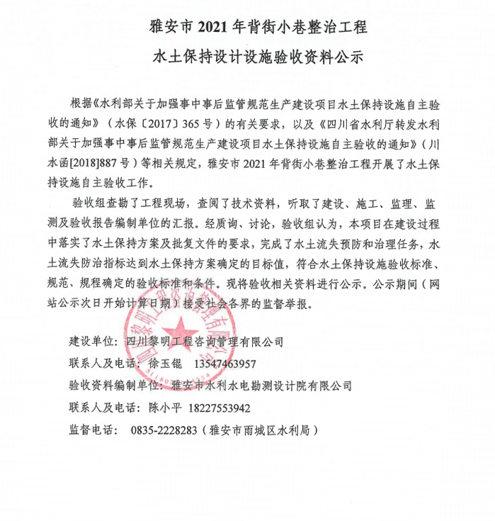 雅安市2021年背街小巷整治工程水土保持設計設施驗收資料公示