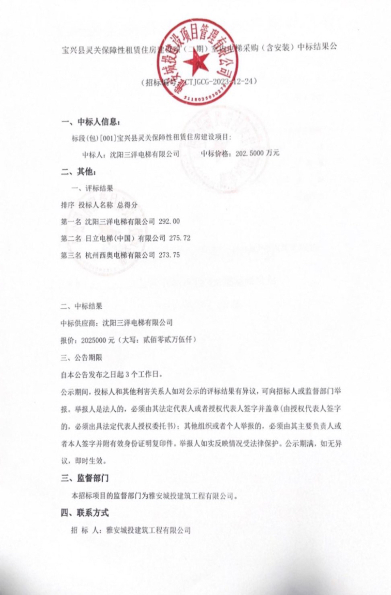 寶興縣靈關(guān)保障性租賃住房建設(shè)項(xiàng)目(二期)室內(nèi)電梯采購(含安裝)中標(biāo)結(jié)果公示