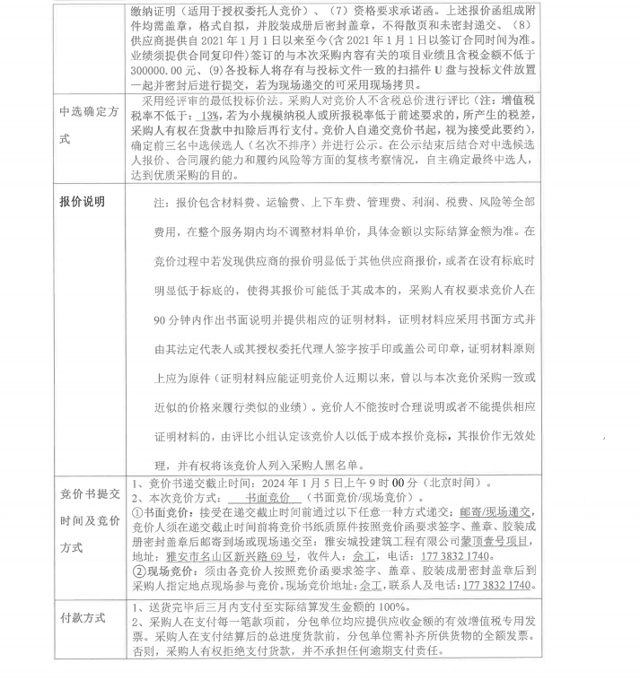 蒙頂壹號(hào)零星材料采購(gòu)競(jìng)價(jià)公告