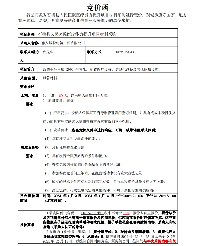 石棉縣人民醫(yī)院醫(yī)療能力提升項(xiàng)目材料采購競價(jià)公告