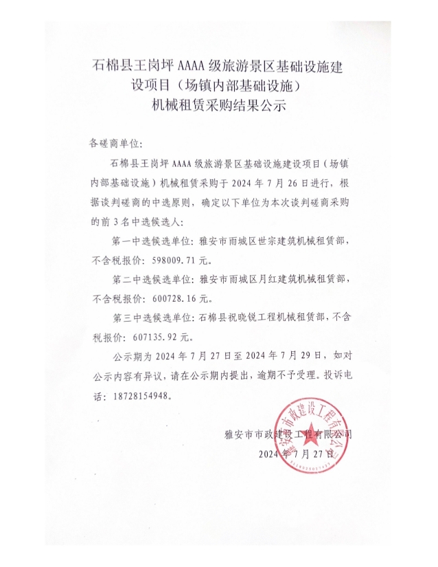 石棉縣王崗坪AAAA級旅游景區(qū)基礎(chǔ)設(shè)施建設(shè)項目(場鎮(zhèn)內(nèi)部基礎(chǔ)設(shè)施)機械租賃采購結(jié)果公示