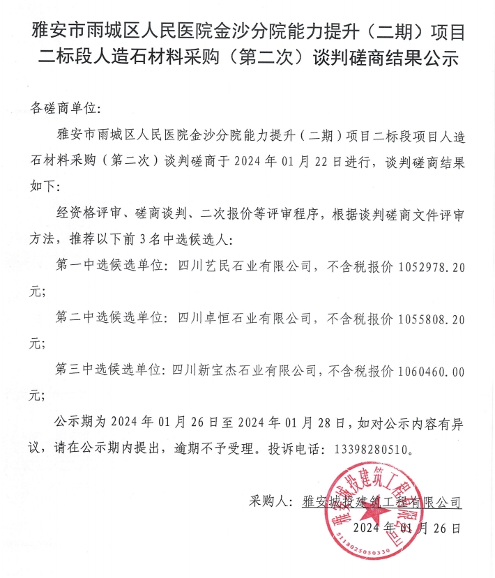雅安市雨城區(qū)人民醫(yī)院金沙分院能力提升(二期)項(xiàng)目二標(biāo)段人造石材料采購(gòu)(第二次)談判磋商結(jié)果公示