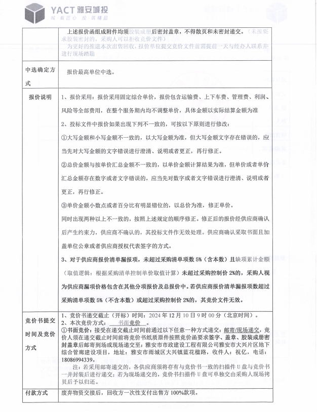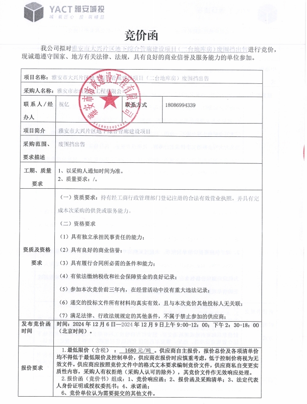雅安市大興片區(qū)地下綜合管廊建設(shè)項(xiàng)目(二臺(tái)地庫房)廢圍擋出售競(jìng)價(jià)公告