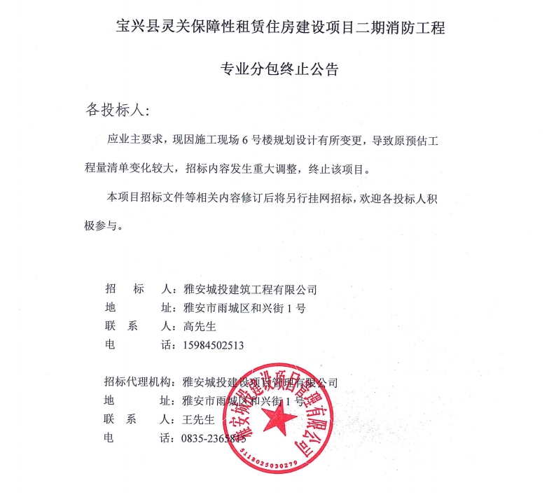 寶興縣靈關(guān)保障性租賃住房建設(shè)項(xiàng)目二期消防工程專(zhuān)業(yè)分包終止公告