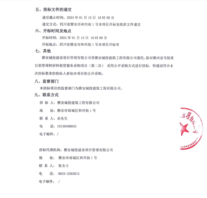 雅州壹號院項目架管周轉材料租賃服務采購項目(第二次)公告