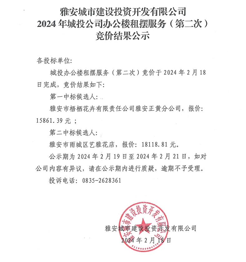 雅安城市建設投資開發(fā)有限公司2024年城投公司辦公樓租擺服務(第二次)競價結(jié)果公示