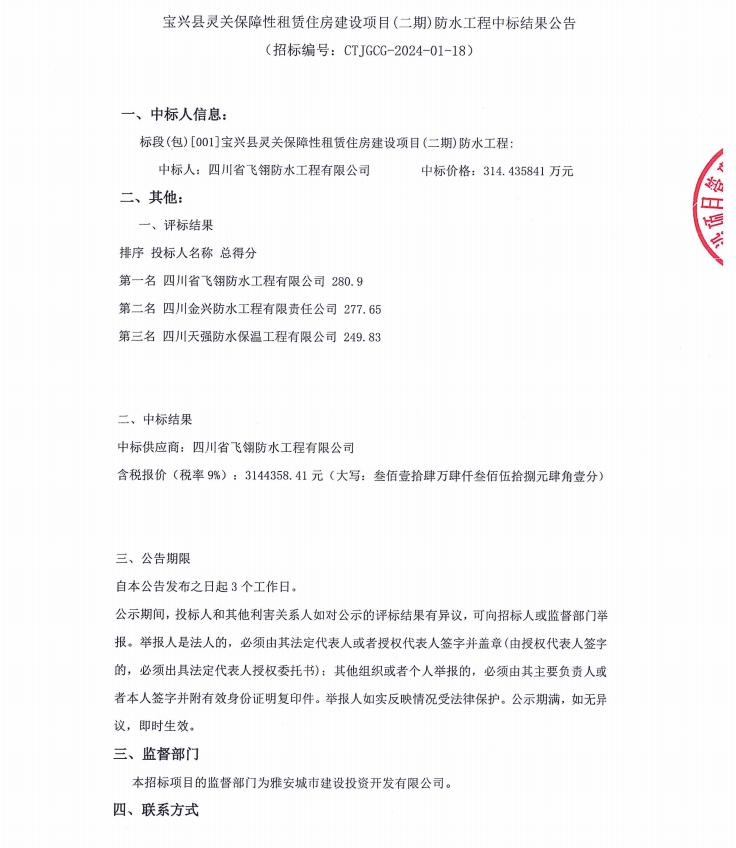 寶興縣靈關(guān)保障性租賃住房建設(shè)項目(二期)防水工程中標結(jié)果公告