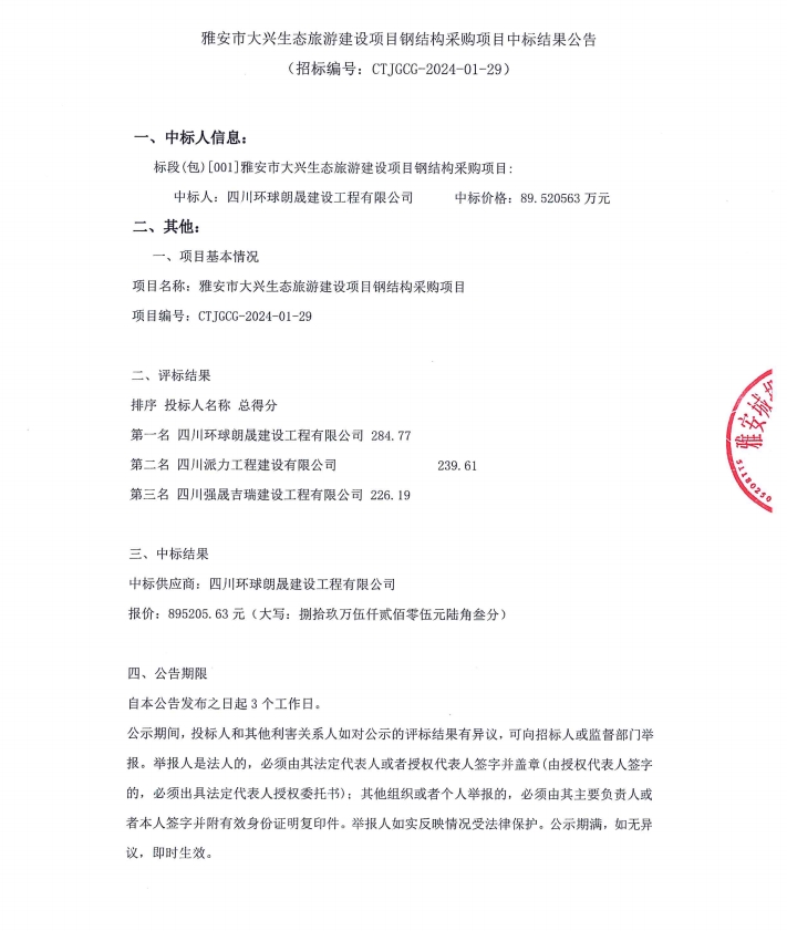 雅安市大興生態(tài)旅游建設(shè)項(xiàng)目結(jié)構(gòu)采購(gòu)項(xiàng)目中標(biāo)結(jié)果公告