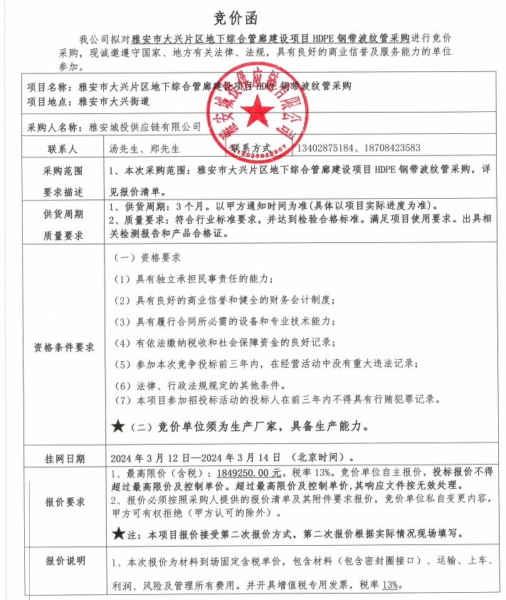 雅安市大興片區(qū)地下綜合管廊建設(shè)項(xiàng)目HDPE鋼帶波紋管采購競價(jià)公告