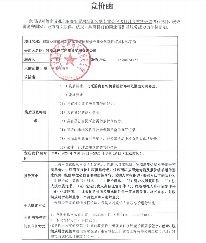 穆家及雅東麗都安置房裝飾裝修專業(yè)分包項目燈具材料采購競價公告