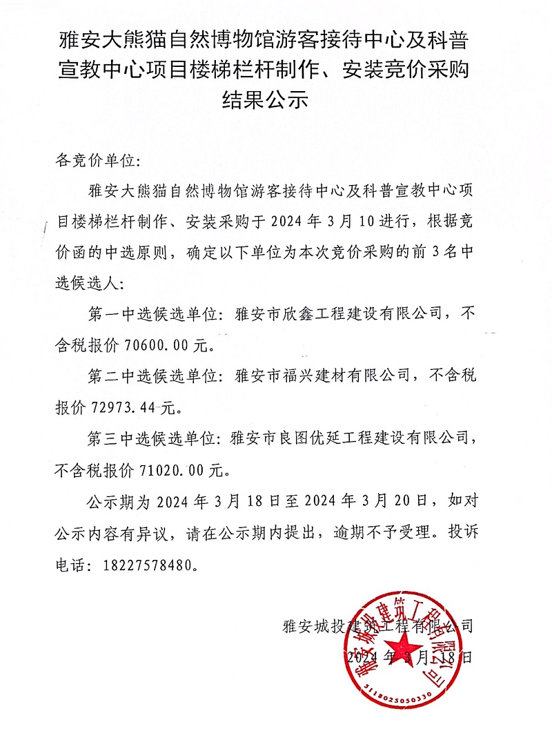 雅安大熊貓自然博物館游客接待中心及科普宣教中心項目樓梯欄桿制作、安裝競價采購結果公示